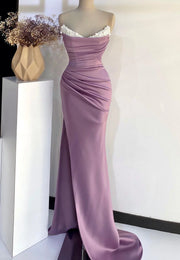 V-Neck Pearl Straplesss Pleated Side Slit Sheath Prom Dress simple gentle atmospheric and unique desi Bring summer colors to enhance whiteness