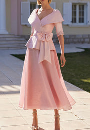 V-Neck Short Sleeves Bowknot A-Line Mother of Bride Dress simple gentle atmospheric and unique desi Bring summer colors to enhance whiteness