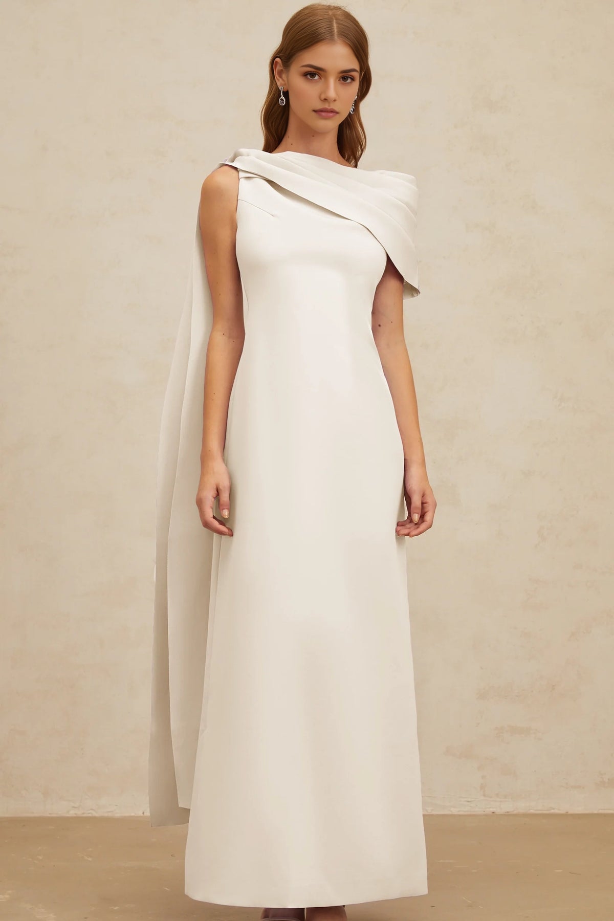 Elevate your evening elegance with this White Asymmetrical Drape Maxi Dress. It features an asymmetrical neckline with a flowing drape detail, a sleek silhouette, and a side slit for graceful movement. Perfect for weddings, galas, or any occasion where you want to make a sophisticated statement.