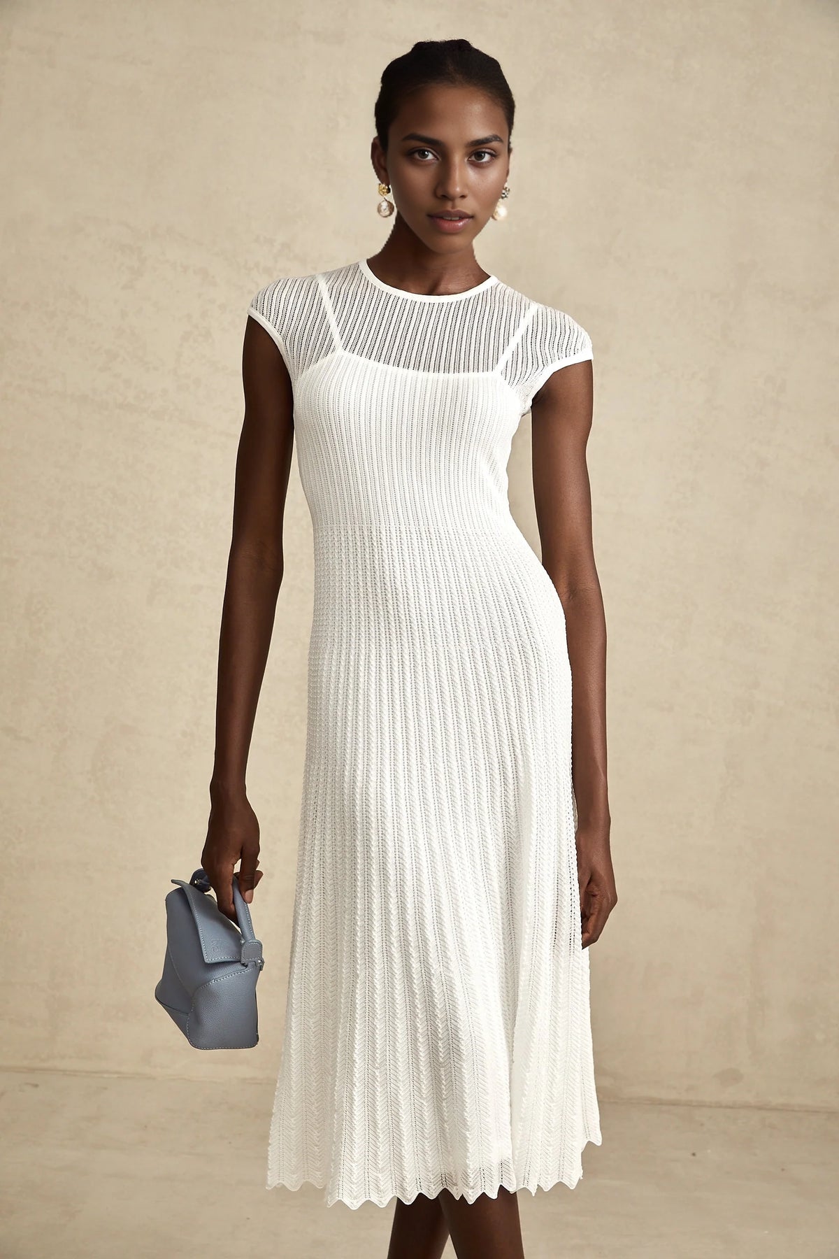 White Knit Cap Sleeve Midi Dress white scallop-hem semi-sheer midi dress Evening Dress