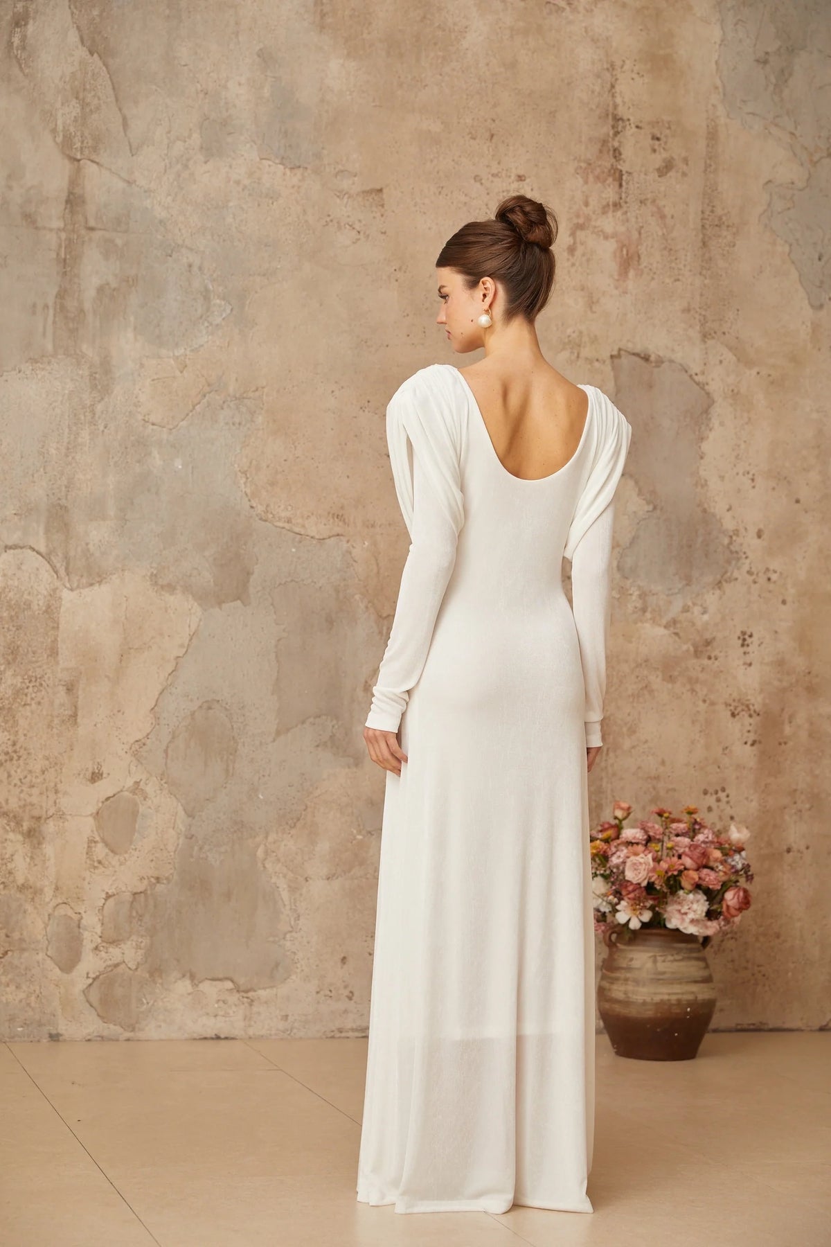 White Long Sleeve Maxi Dress with Cutout Detail Margot white draped shirred maxi dress Evening Dress Prom, black tie events, formal weddings, and upscale parties