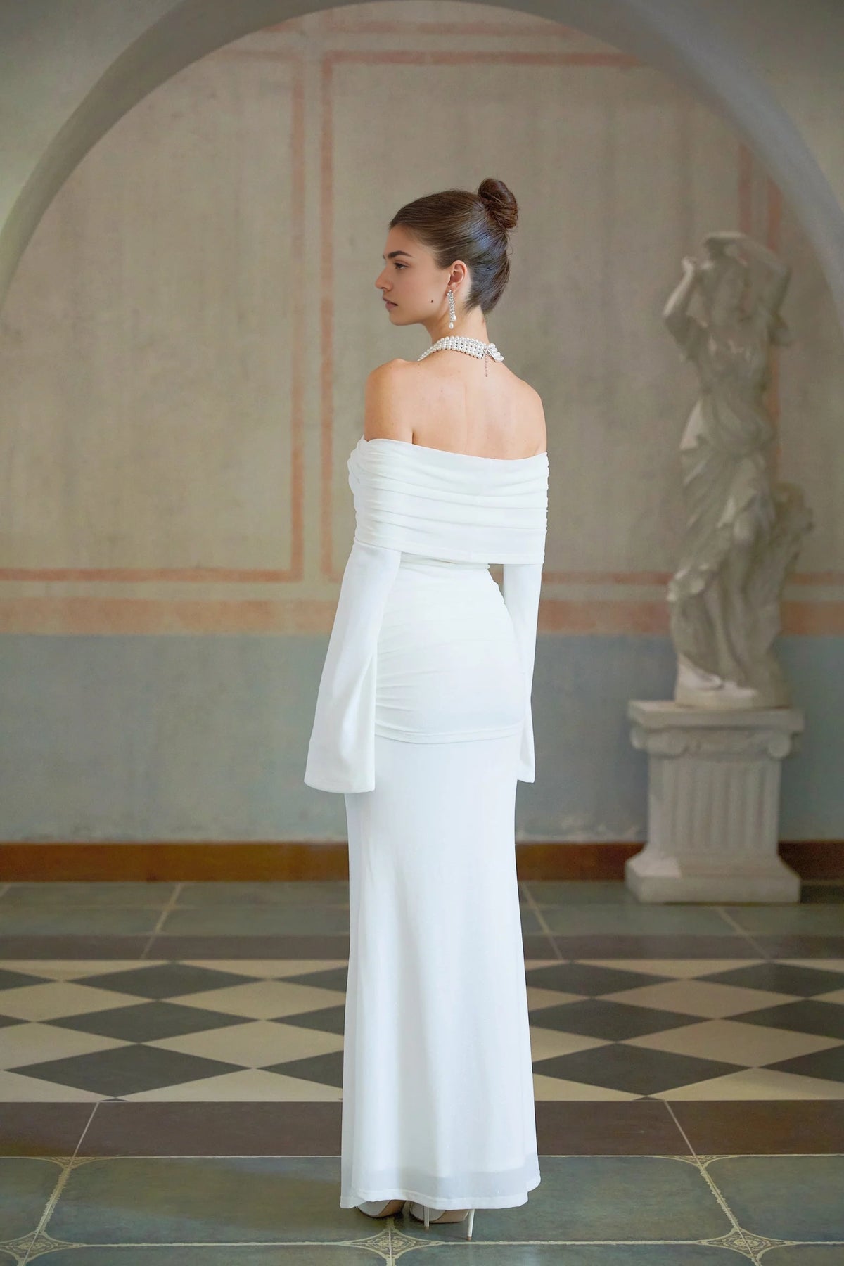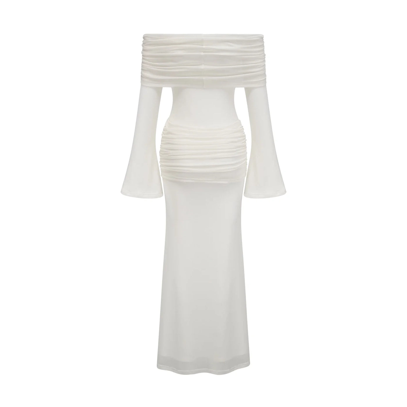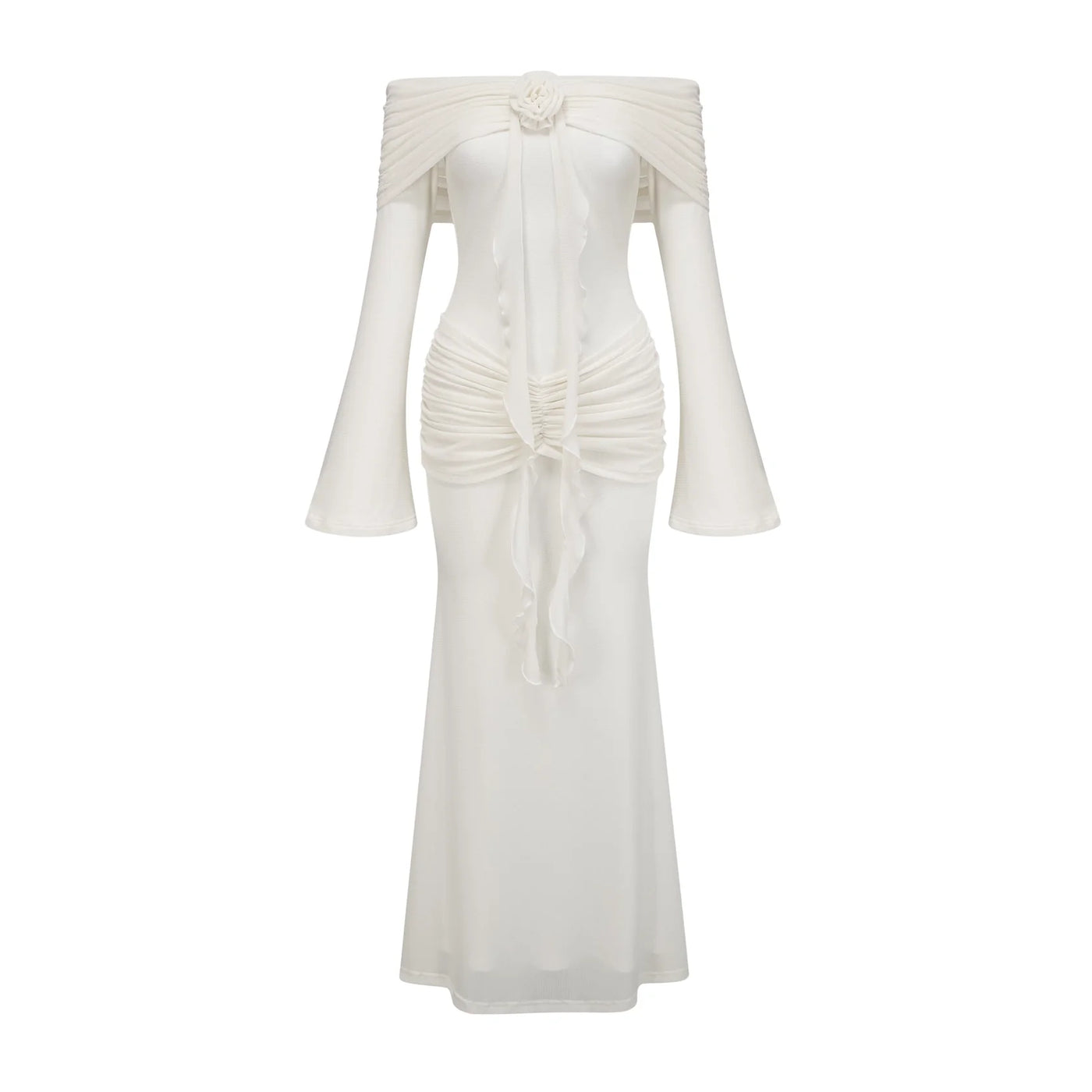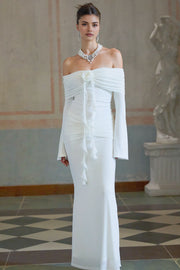 Embrace timeless elegance with this White Off - Shoulder Long Sleeve Maxi Dress. It features an off - shoulder neckline, flowing long sleeves, a floral accent at the bust, and a ruched bodice that flatters the figure. Perfect for weddings, formal events, or any occasion where you want to exude classic charm.