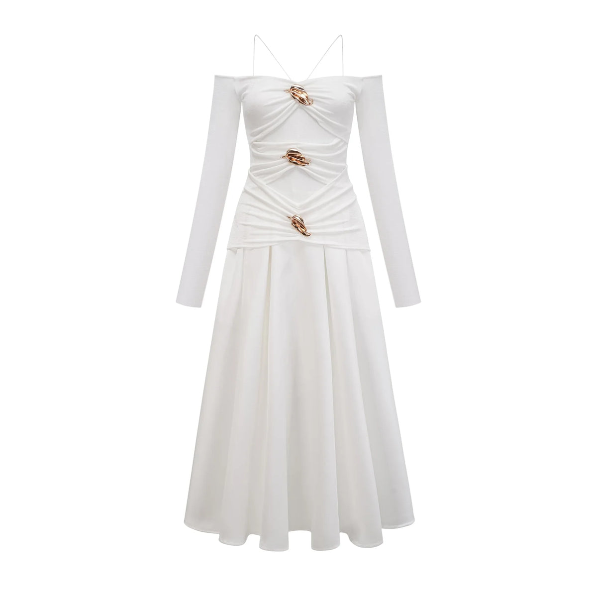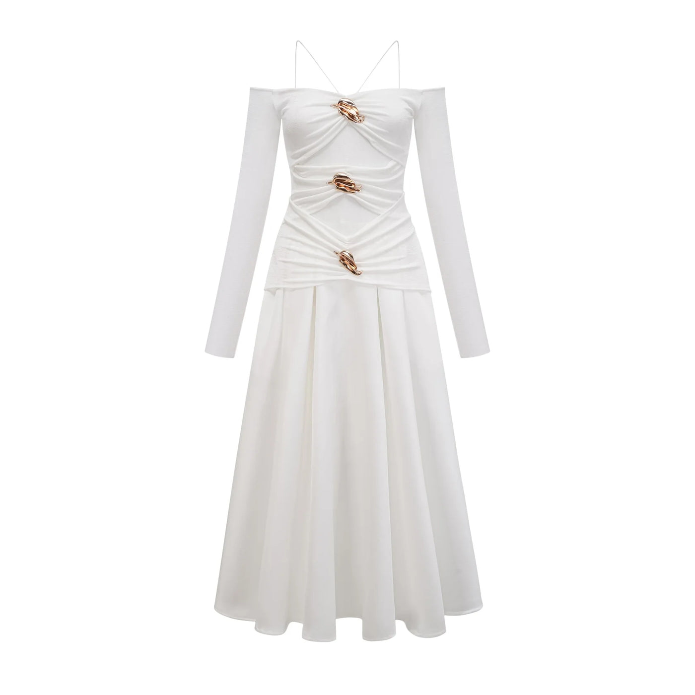 White Off - Shoulder Maxi Dress with Gold Accents Nadine off-shoulder panelled maxi dress in White