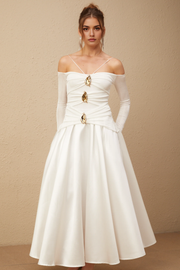 Radiate elegance with this White Off - Shoulder Maxi Dress. It features delicate off - shoulder straps, long sheer sleeves, and eye - catching gold leaf accents. The flowing silhouette makes it perfect for weddings, formal events, or any occasion where you want to shine with sophisticated charm.