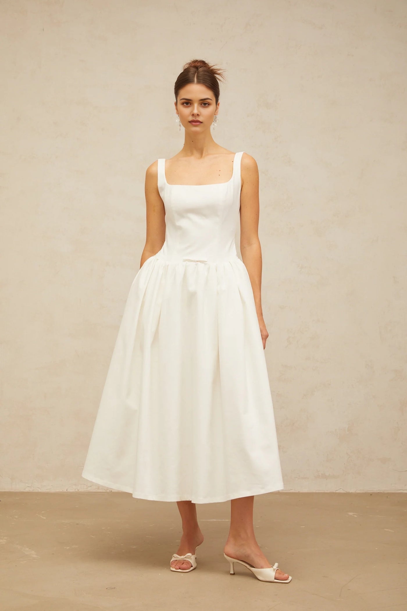 White Square Neck Midi Dress with Full Skirt white bowknot flounce midi dress Evening Dress black tie events, formal weddings, and upscale partie