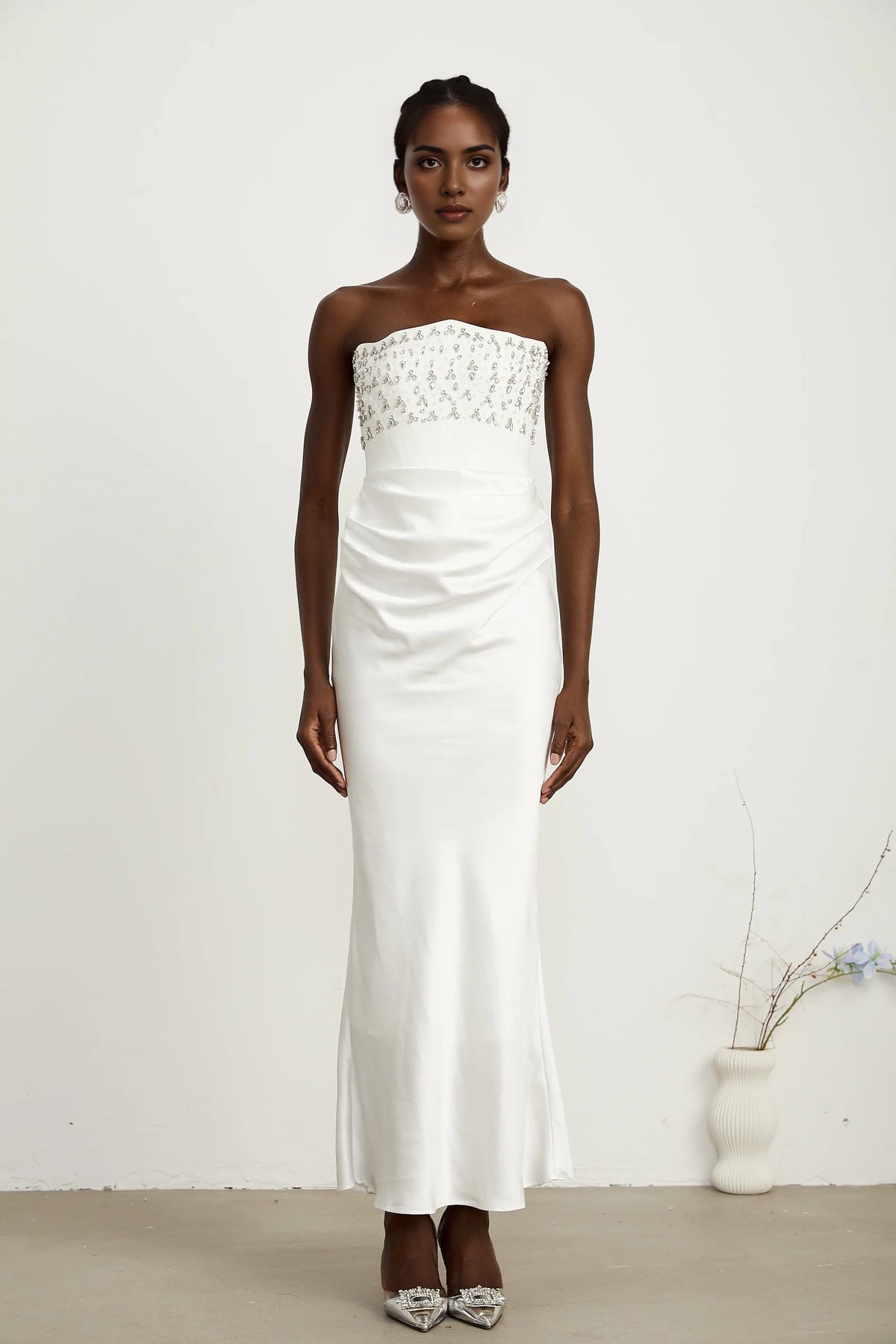 White Strapless Satin Maxi Dress with Embellished Bodice Aurore White Crystal Embellished Maxi Dress Evening Dress