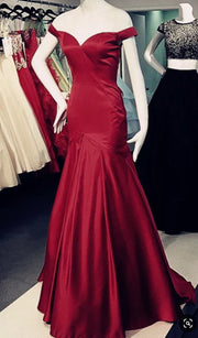 Wine red satin dress with off shoulder heart-shaped neckline and slim fishtail skirt, Prom, black tie events, formal weddings, and upscale parties