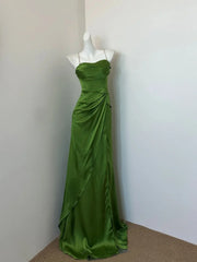 Vintage green slim shoulder strap strapless satin dress with pleated design showcasing elegant temperament:Prom, black tie events, formal weddings, and upscale parties
