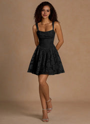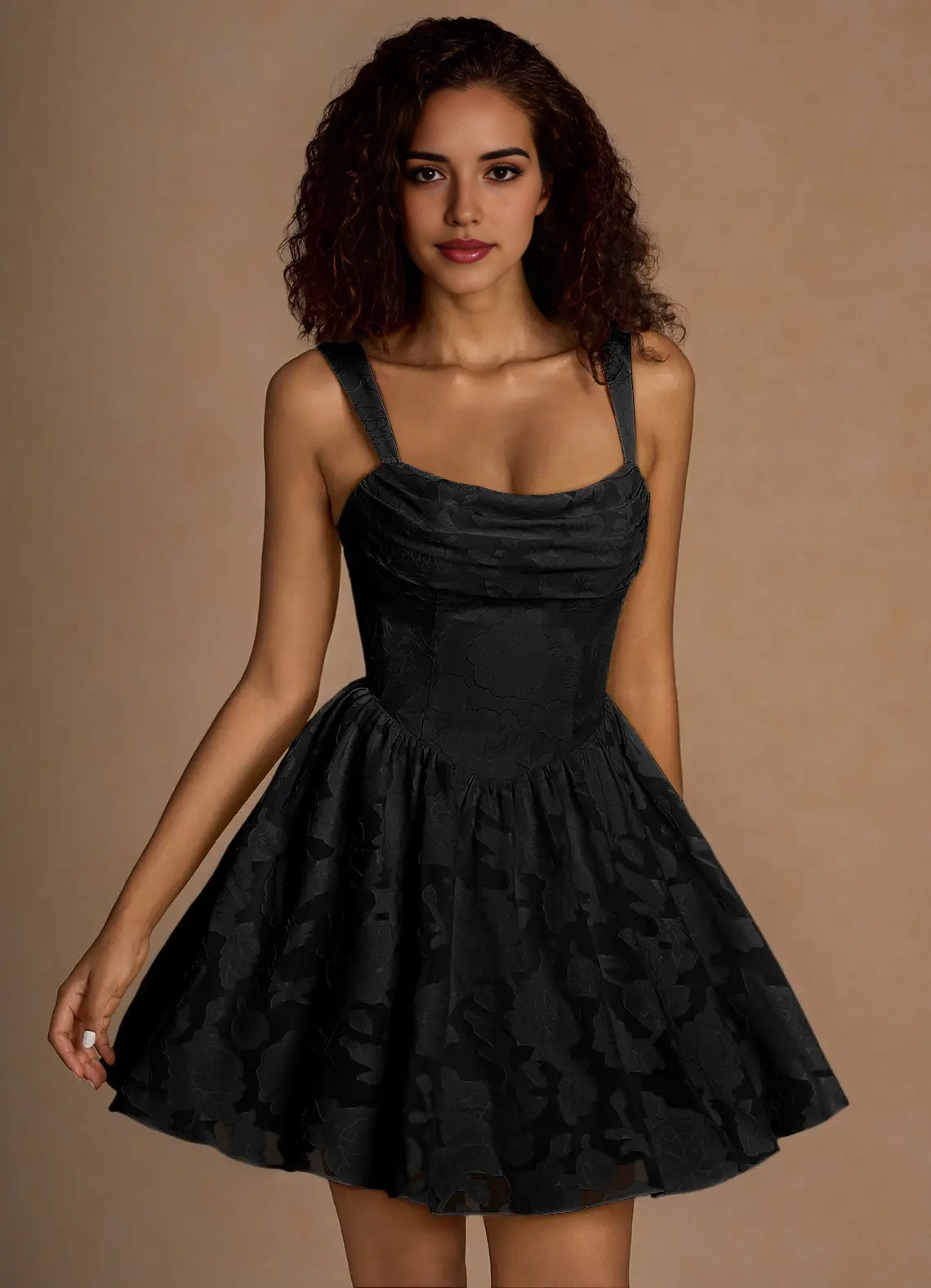 Black Floral Jacquard Mini Dress with Lace - Up Back and Cowl Neck Ivy Black Mini Dress Homecoming Dresses Prom, black tie events, formal weddings, and upscale parties
