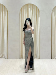 Classy Mermaid Off The Shoulder Gray Sequin Long Prom Dresses Formal Gown Summer Wedding Guest Dress Wedding Guest Attire simple gentle atmospheric and unique desi Bring summer colors to enhance whiteness