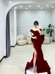 Classy Mermaid Off The Shoulder Satin Burgundy Short Sleeves Evening Dress Long Prom Dresses simple gentle atmospheric and unique desi Bring summer colors to enhance whiteness