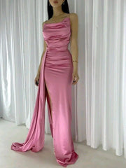 Classy Sheath Spaghetti Straps Pink Slit Satin Formal Long Prom Gown Summer Wedding Guest Dress Bridal Guest Dresses Wedding Outfits For Guest