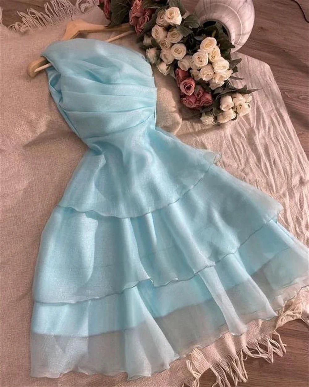 Elegant One Shoulder Party Layered Evening Dress Homecoming Dress Blue Beach Dress