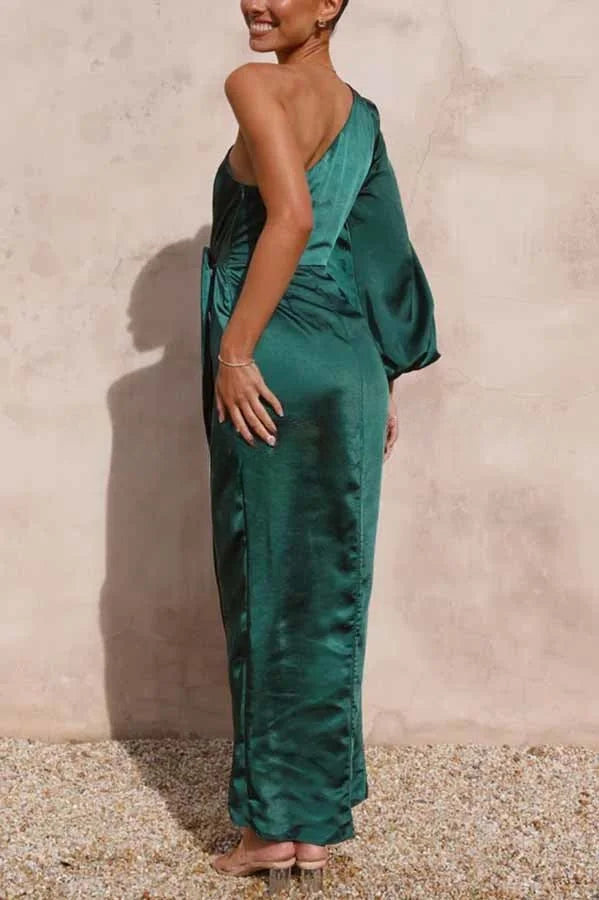 Endearing Romance Satin One Shoulder Front Tie Up Slit Maxi Dress Simple atmospheric beautiful and unique desi