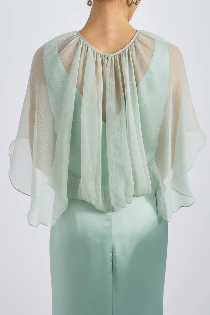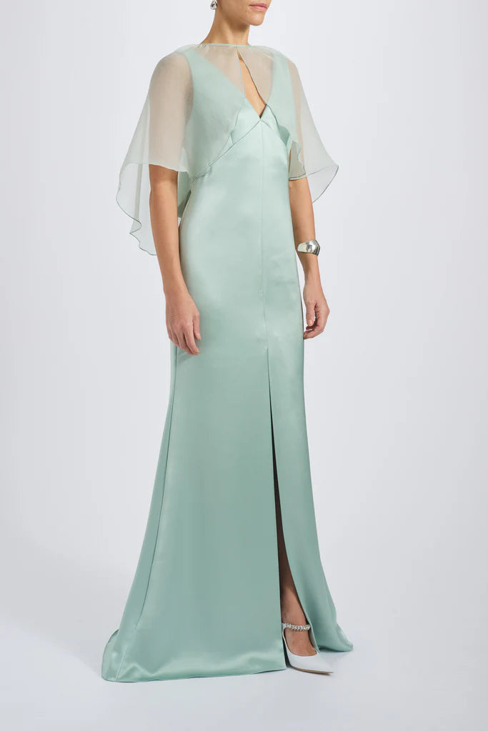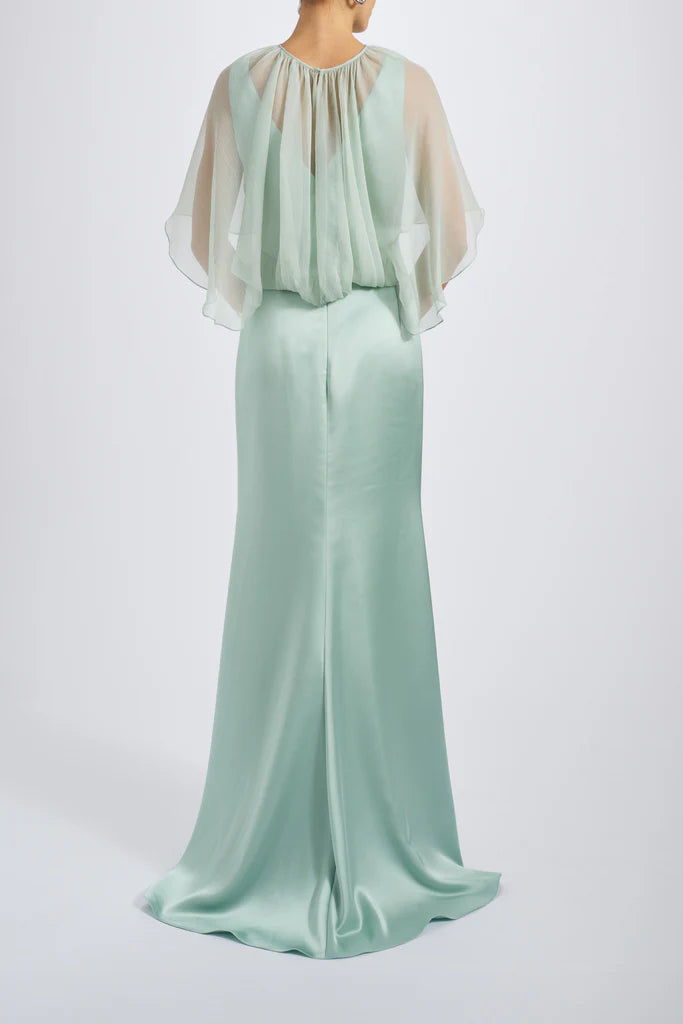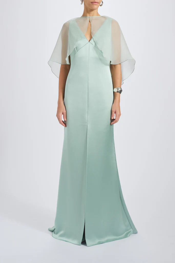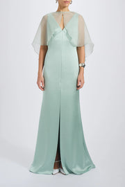 Fluid satin V-neck gown with silk chiffon cocoon detail spheric beautiful and unique desig