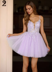 Step into a world of enchantment with this Lavender Tulle Mini Dress. The delicate tulle skirt, adorned with floral appliqué and shimmering details, creates a dreamy look. The lace - up back adds allure, making it perfect for proms, parties, or any magical occasion.
