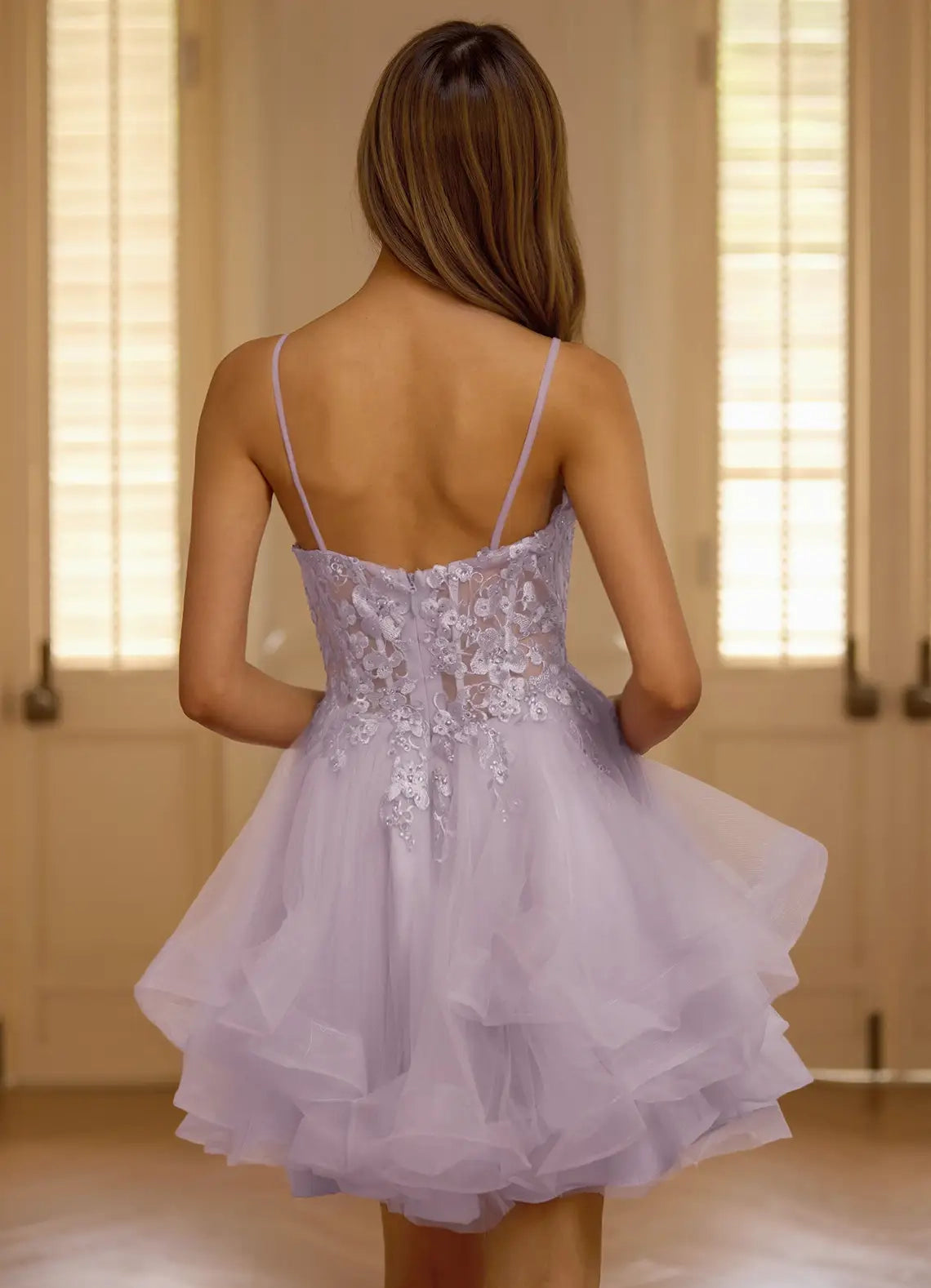 Lavender Tulle Spaghetti Strap Mini Dress with Lace Detail Viviara Purple Mini Dress Homecoming Dresses black tie events, formal weddings, and upscale parties