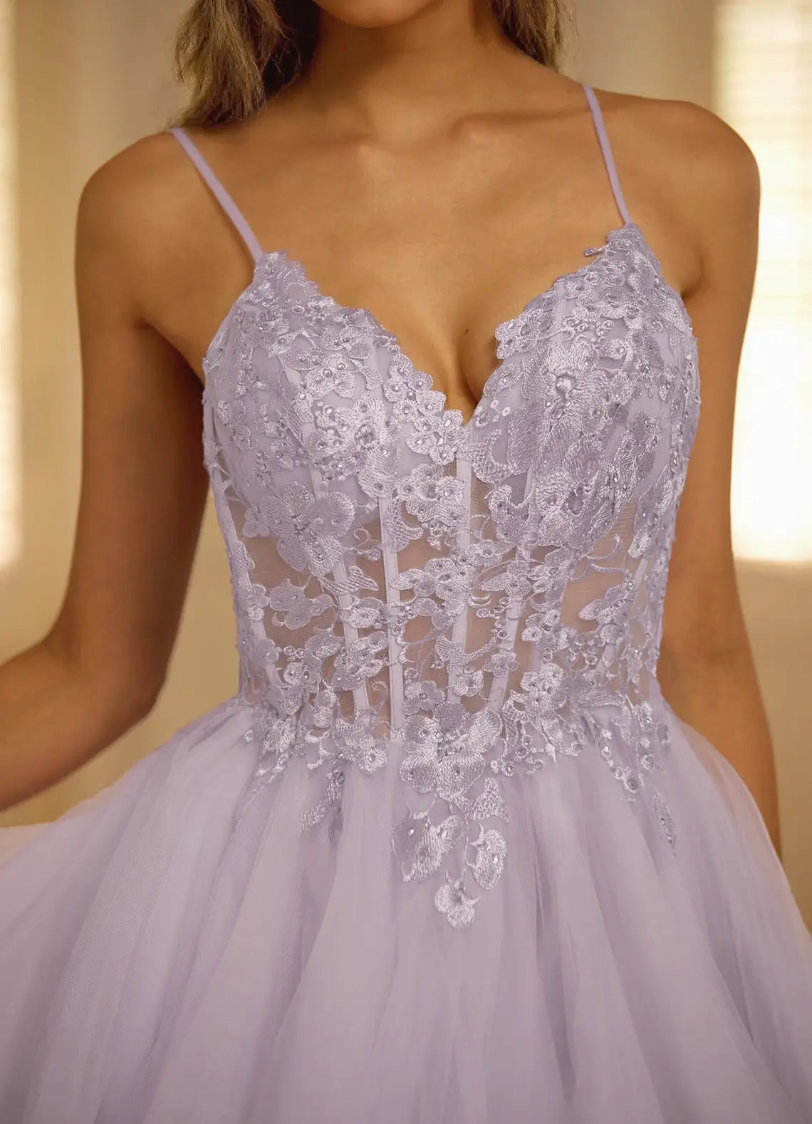 Step into a fairy - tale charm with this Lavender Tulle Spaghetti Strap Mini Dress. The tulle skirt, lace detailing, and spaghetti straps create a dreamy silhouette. Perfect for parties or special occasions, it ensures you stand out with elegance.