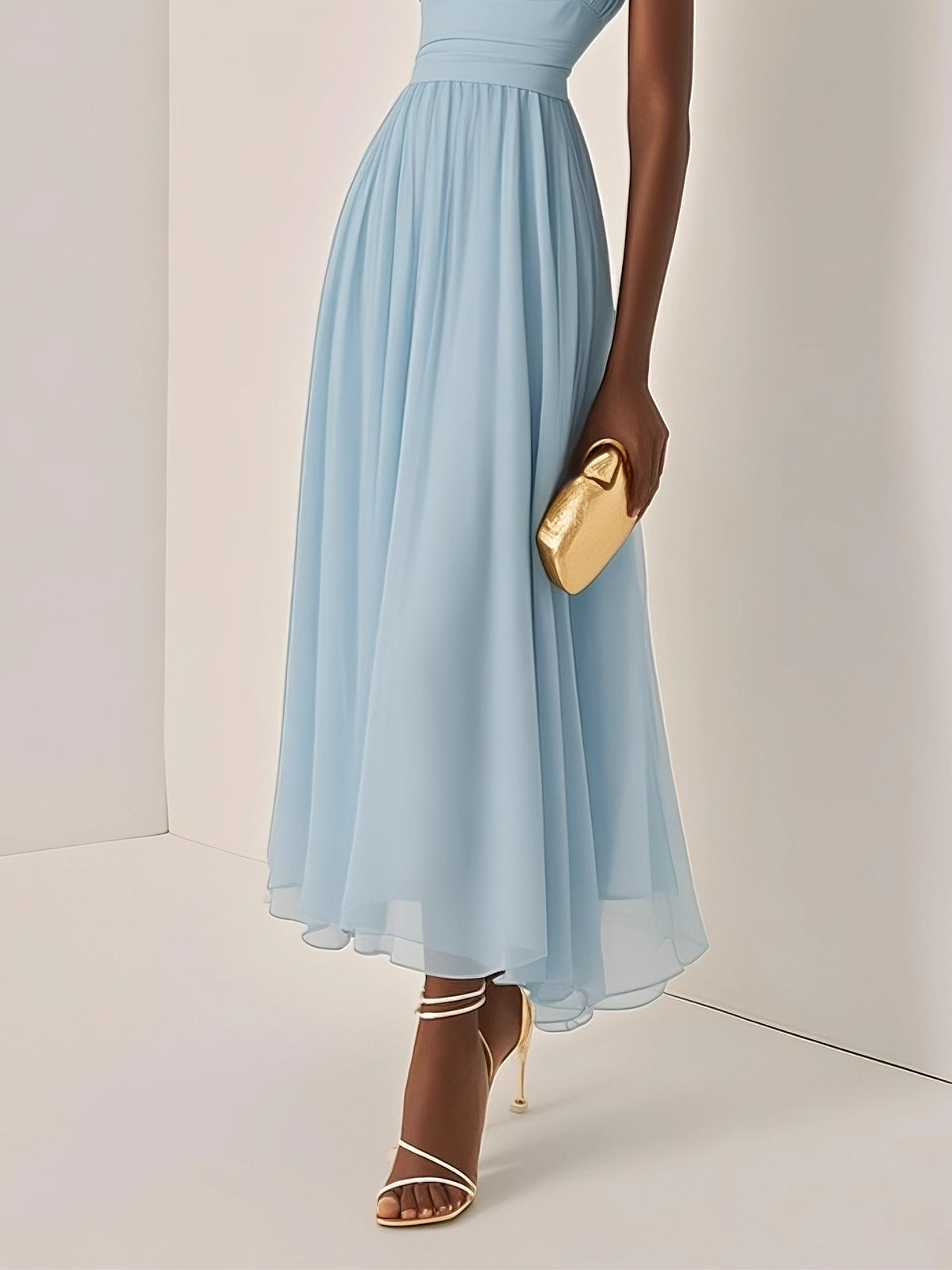 Light Blue Ruched Chiffon One Shoulder Sleeveless A-Line Maxi Dress simple gentle atmospheric and unique desi Bring summer colors to enhance whiteness