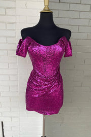 Magenta Sequin Off-the-Shoulder Short Homecoming Dress