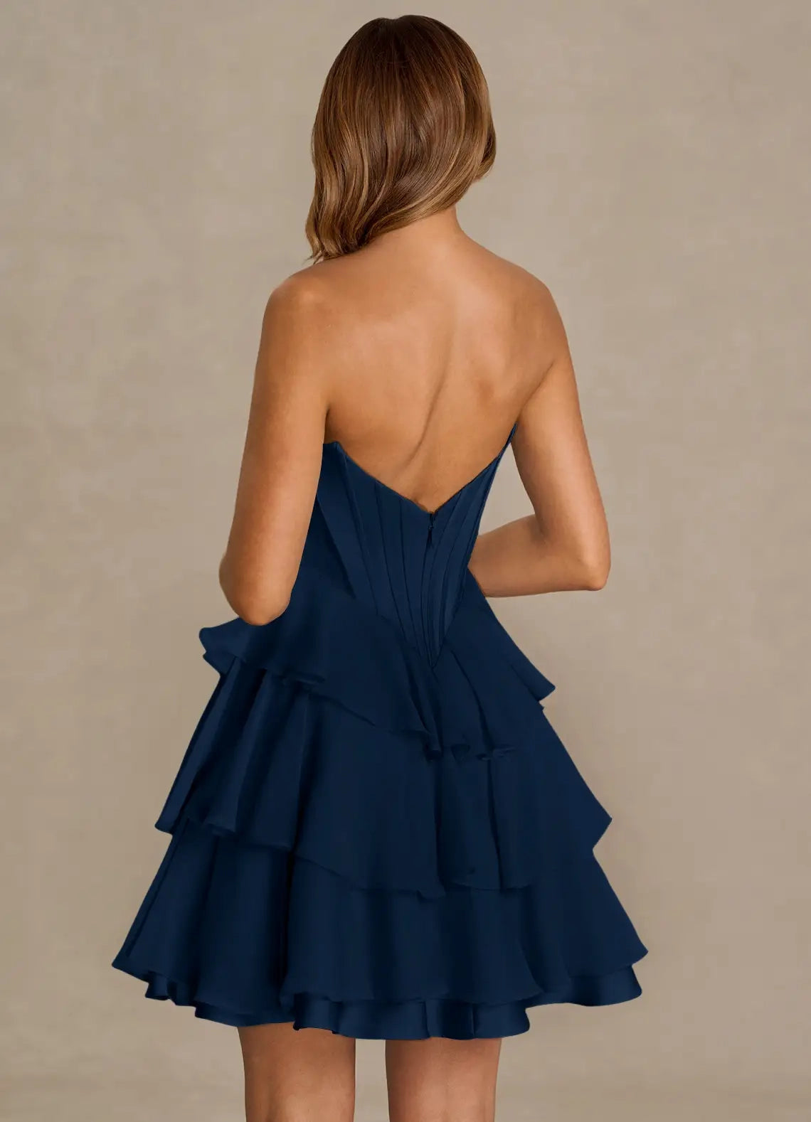Navy Blue Strapless Ruffled Mini Dress with Corset Detail Navy Mini Dress Homecoming Dresses Prom, black tie events, formal weddings, and upscale parties