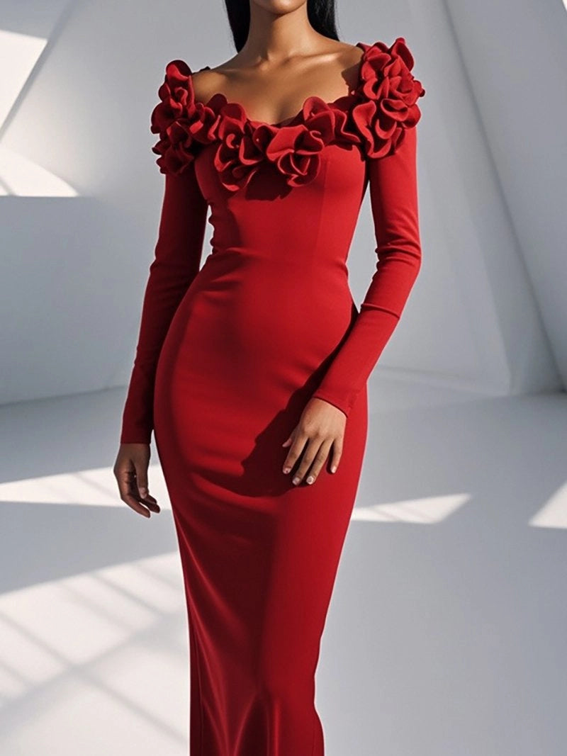 Red 3D Floral Long Sleeve Sheath Maxi Dress simple gentle atmospheric and unique desi Bring summer colors to enhance whiteness - US 2 / UK 6 / EU 32