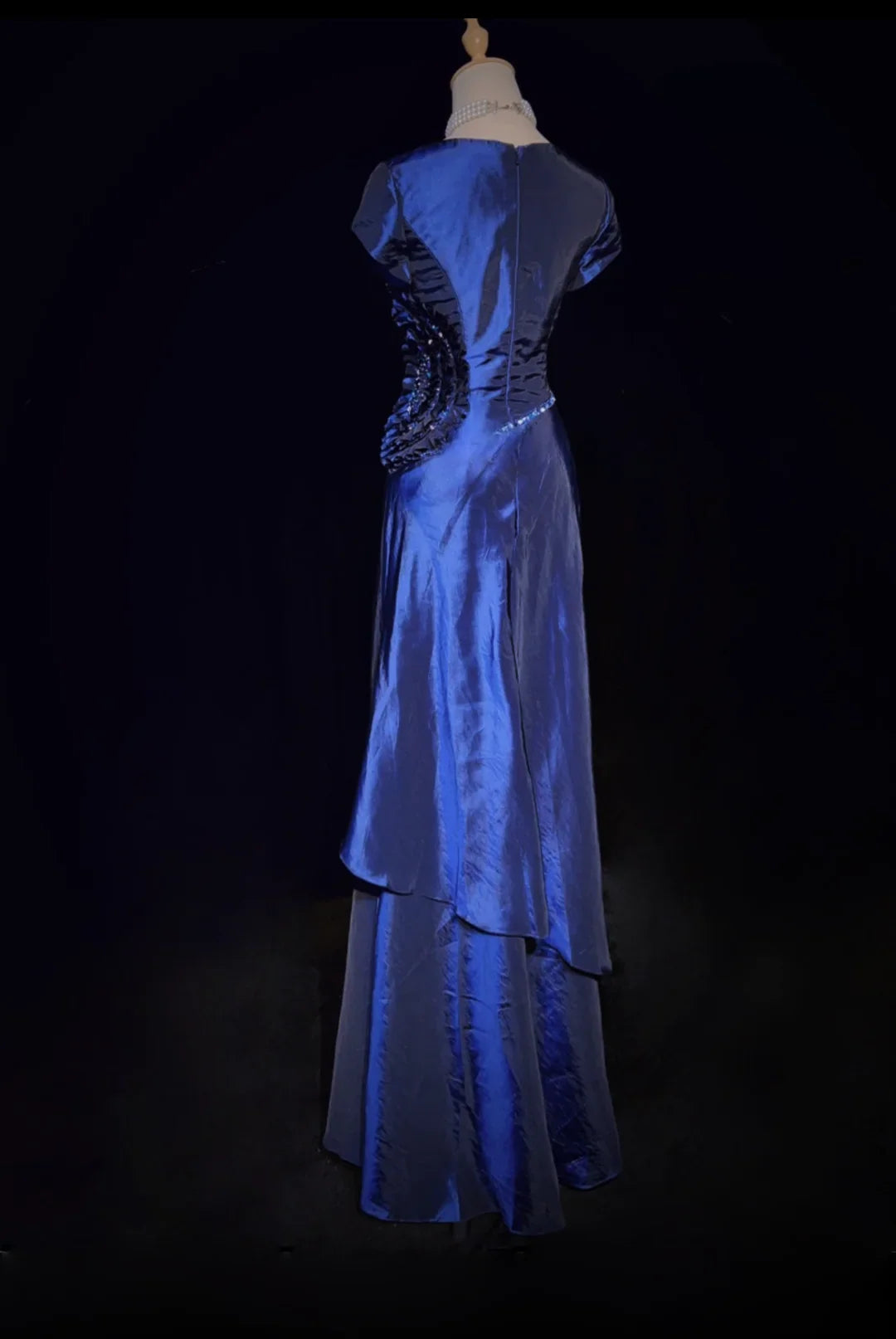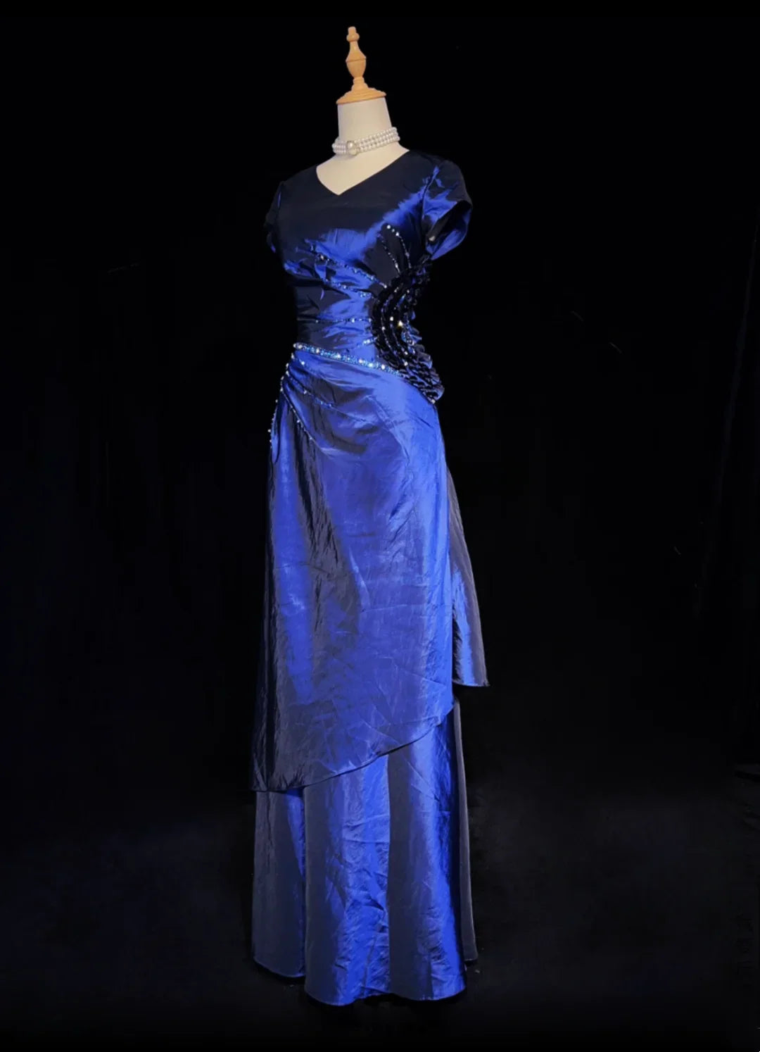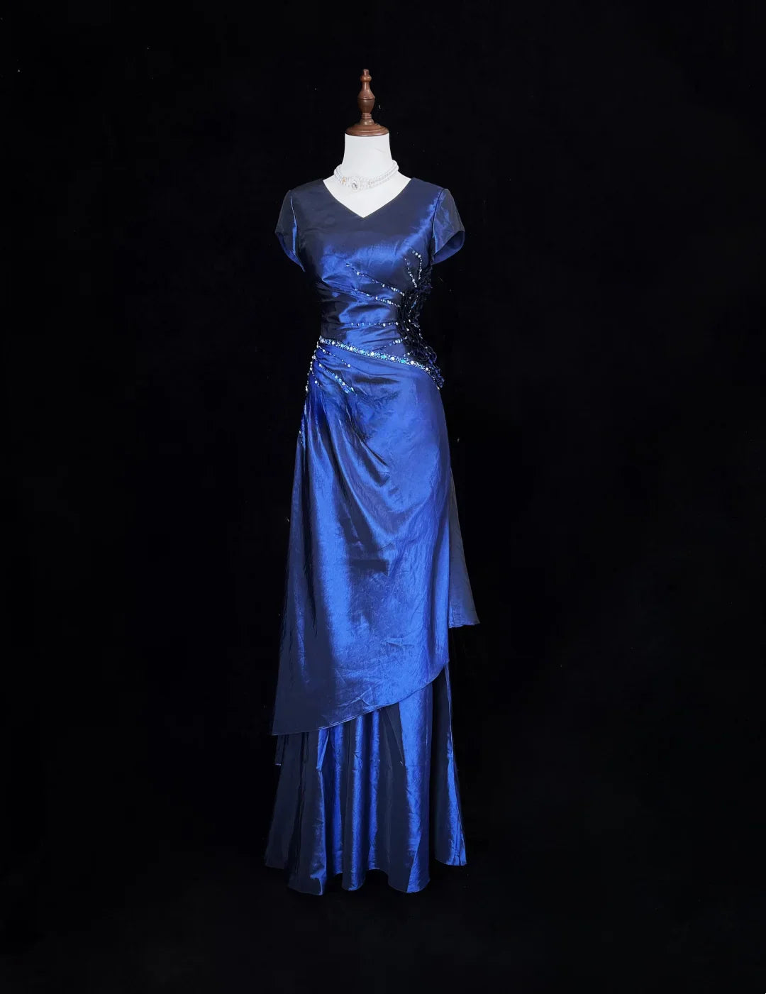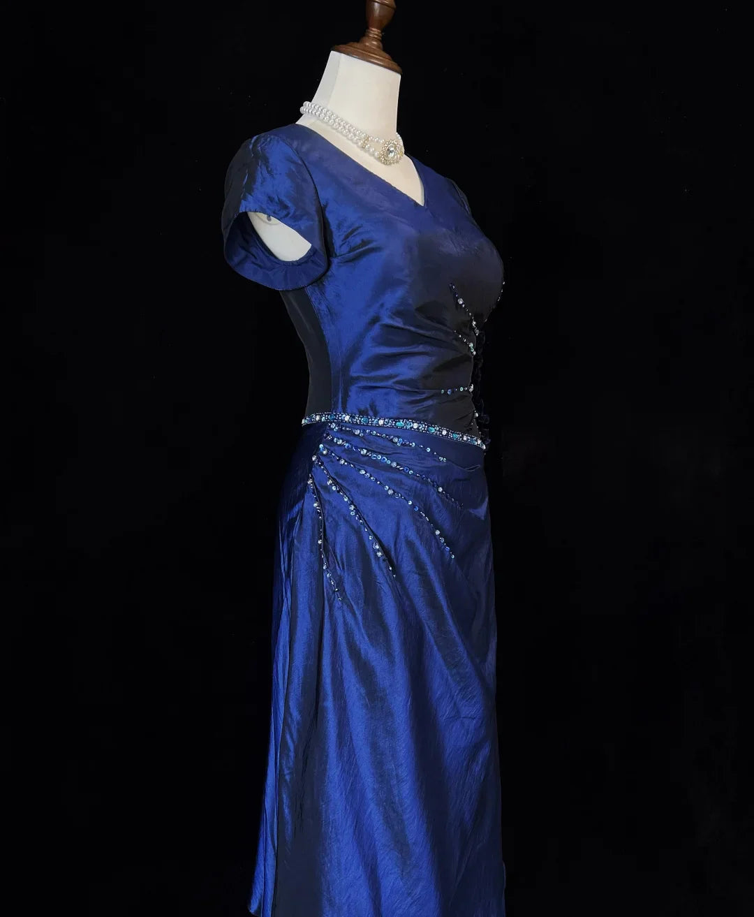 Retro A Line V Neck Navy Blue Short Sleeves With Silver Beads Long Flowers Prom Dresses Party Dress 21st Birthday Outfits Graduation Dresses - US 2 / UK 6 / EU 32