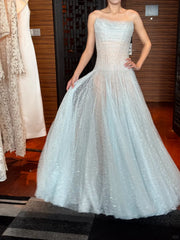 Romantic Blue A Line Strapless Sequin Tulle Long Prom Dress Gown Dress simple gentle atmospheric and unique desi Bring summer colors to enhance whiteness