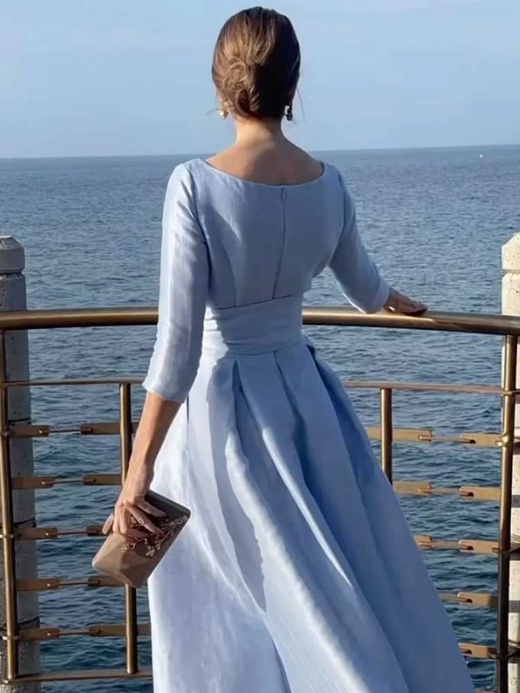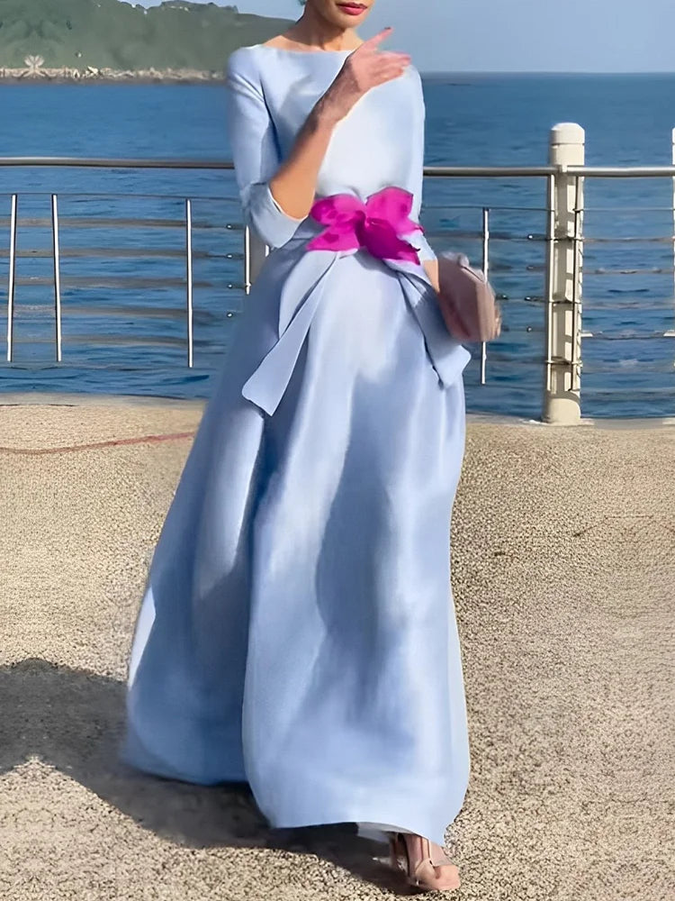 Three-Quarter Sleeves Solid Color Tied Waist Boat Neck Maxi Dresses Simple atmospheric beautiful and unique desi
