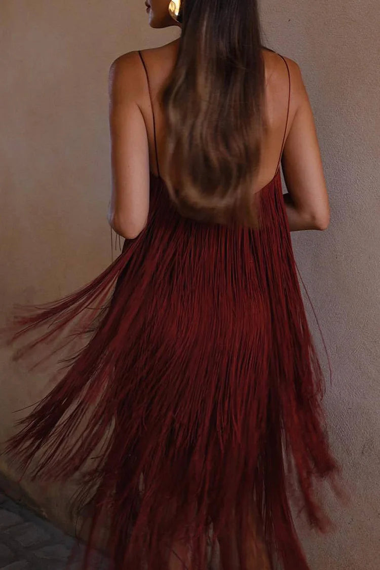Sexy Vintage Solid Tassel Square Collar Sling Dress Dresses Simple atmospheric beautiful and unique desi