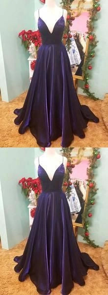 Simple purple v neck satin long prom dress evening dress