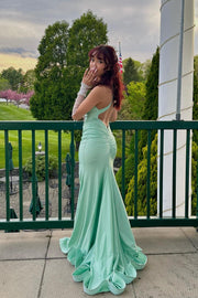 V Neck Green Satin Mermaid Long Prom Dress with Cross Back Simple atmospheric beautiful and unique desi