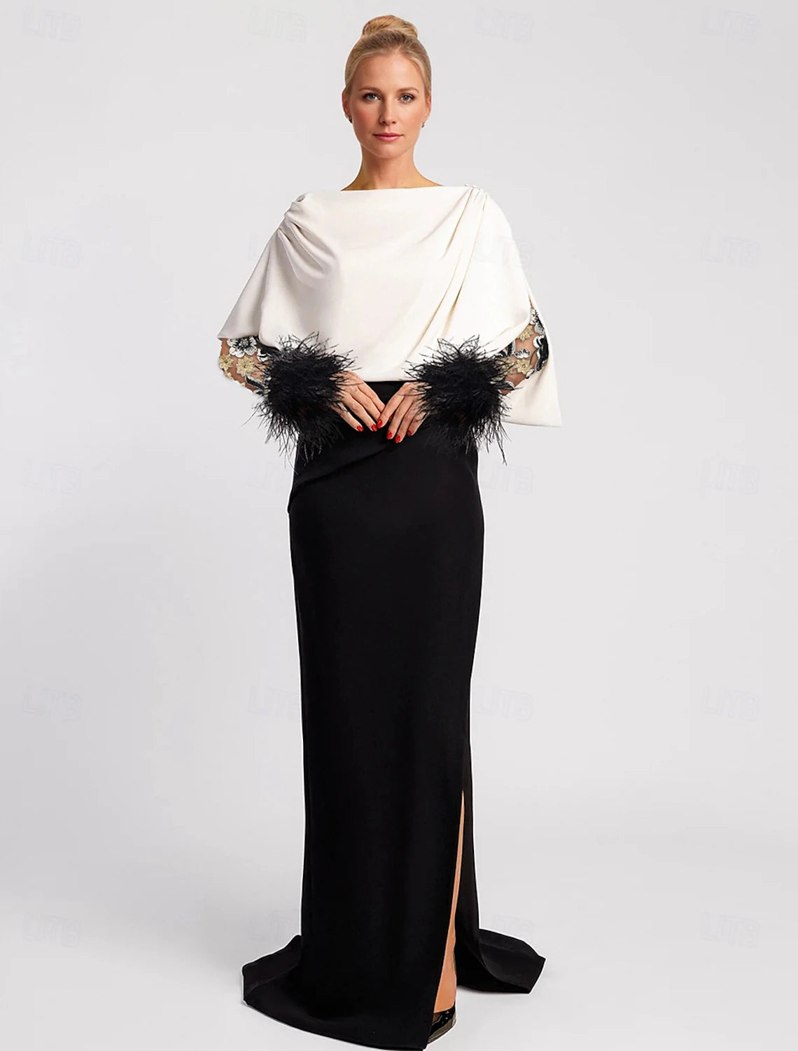 Black Dress Mermaid Evening Gown Elegant Dress Formal Sweep / Brush Train Long Sleeve Illusion Neck Champagne Mother Of the Bride Dress Stretch Crepe with Feather - US 2 / UK 6 / EU 32