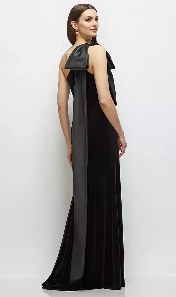 Black One Hull Velvet Maxi Dress with Bow satin twill bow Mother of the Bride Dresses black tie events, formal weddings, and upscale parties