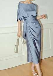 Blue Short Sleeve Satin A-Line Tie Waist Midi Dress simple gentle atmospheric and unique desi Bring summer colors to enhance whiteness - US 2 / UK 6 / EU 32