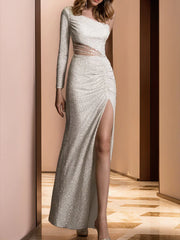 Column One-shoulder Long Sleeves Long Evening Dress with High Split Simple gentle beautiful and unique design