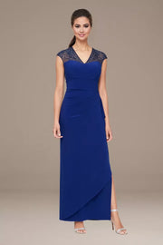 Simple Sheath V Neck Cap Sleeve Lace Back Floor Length Mother of the Bride Dress - US 2 / UK 6 / EU 32