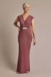 This mother of the bride dress features a sheath silhouette that offers a sleek and figure hugging fit. The V neckline brings a classic and charming touch, while the cap sleeves provide a balanced and stylish look. The plain back detail keeps it simple yet sophisticated, enhancing the dress's overall appeal. With a floor length design, it's ideal for weddings, ensuring the wearer looks elegant and poised.