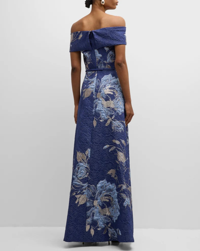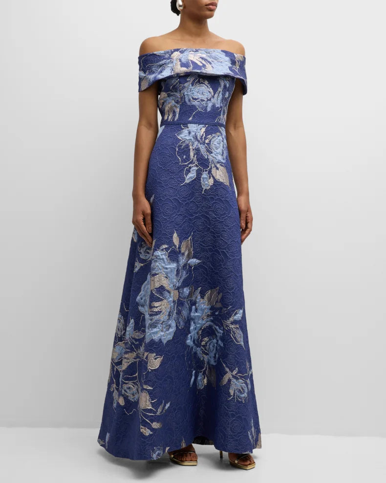 Off-Shoulder Metallic Flower Jacquard Gown Beautiful and charming simple and unique design