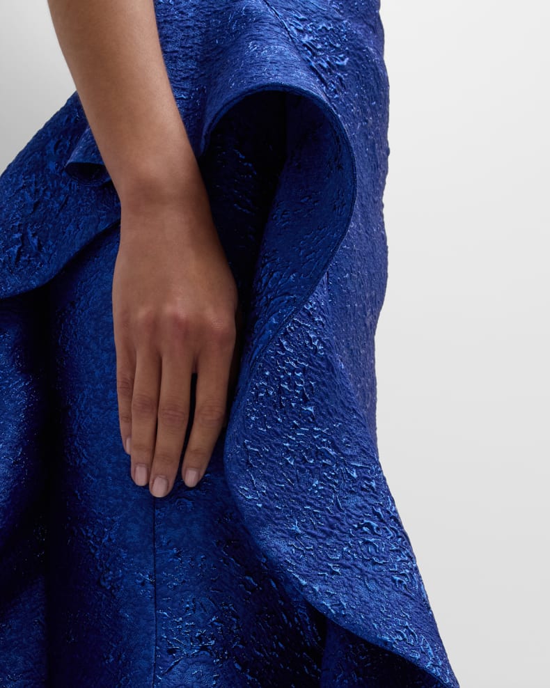 One-Shoulder Ruffle Metallic Jacquard Gown Beautiful and charming simple and unique design