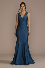 Refined Mermaid V Neck Sleeveless Ruched Back Mother of the Bride Dress Evening Dress Prom, black tie events, formal weddings, and upscale parties