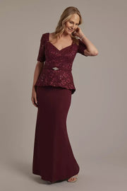 This mother of the bride dress features a two piece silhouette that offers a stylish and versatile fit. The V neckline brings a classic and charming touch, while the short sleeves provide a balanced and elegant look. The lace back detail adds an element of sophistication and charm, enhancing the dress's overall appeal. With a floor length design, it's ideal for weddings, ensuring the wearer looks refined and poised.