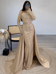 Sheath Sequin Evening Gown Elegant Dress Formal Floor Length Long Sleeve Square Neck Champagne Mother Of the Bride Dress Masquerade Dress