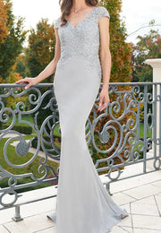 V-Neck Cap Sleeves Appliques Mermaid Mother of Bride Dress simple gentle atmospheric and unique desi Bring summer colors to enhance whiteness