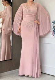 V-Neck Long Sleeves Beading Pleated Mermaid Mother of Bride Dress simple gentle atmospheric and unique desi Bring summer colors to enhance whiteness