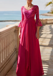V-Neck Long Sleeves Floral Pleated A-Line Mother of Bride Dress simple gentle atmospheric and unique desi Bring summer colors to enhance whiteness