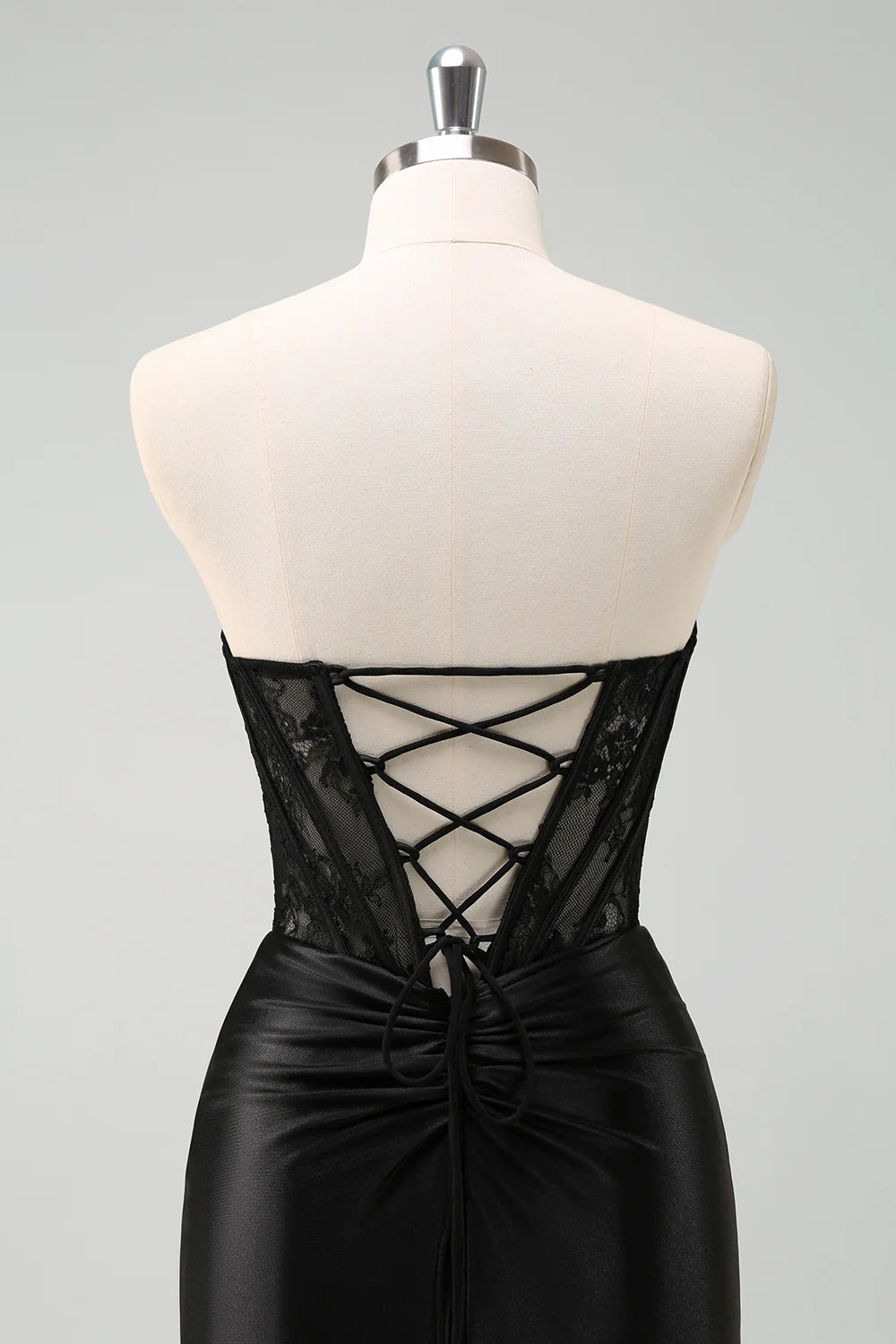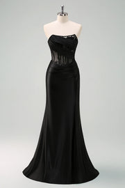 Black Mermaid Strapless Ruched Corset Long Prom Dress with Lace Up Back