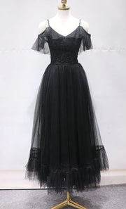 Black off shoulder long dress with suspender design, featuring sheer ruffles on the off shoulder for formal occasions such as dinners and parties