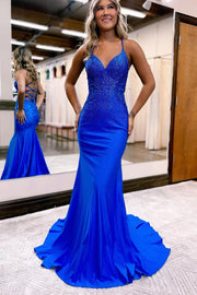 Charming Mermaid Royal Blue Satin Long Prom Dresses with Beading
