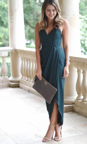 Dark green camisole mid length dress with deep V-neck design suitable for dinners, parties, dates, etc Prom, black tie events, formal weddings, and upscale parties